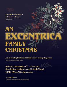 Workshop singers have the opportunity to be Involved in our 90 minute “Excentrica Family Christmas” event (Sunday afternoon Dec. 8 at Southminster-Steinhauer United Church, Edmonton.)